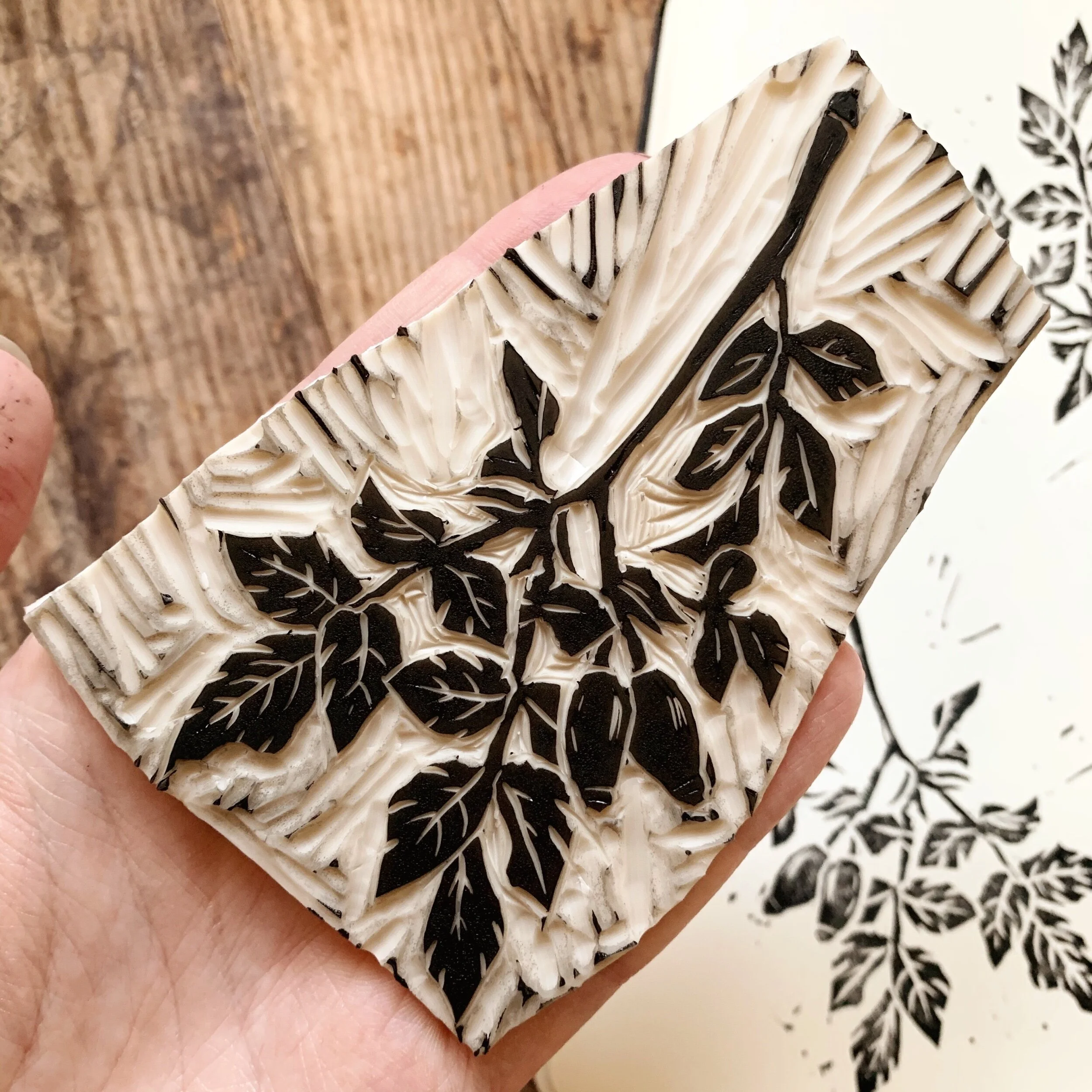 For my first attempt I sketched out some rose hips that I found on a walk and then transferred it over to the lino block to start carving. I didn’t anticipate how much I would actually love the process of carving! It felt so meditative to sit there and mindfully cut away the pieces I didn’t need.