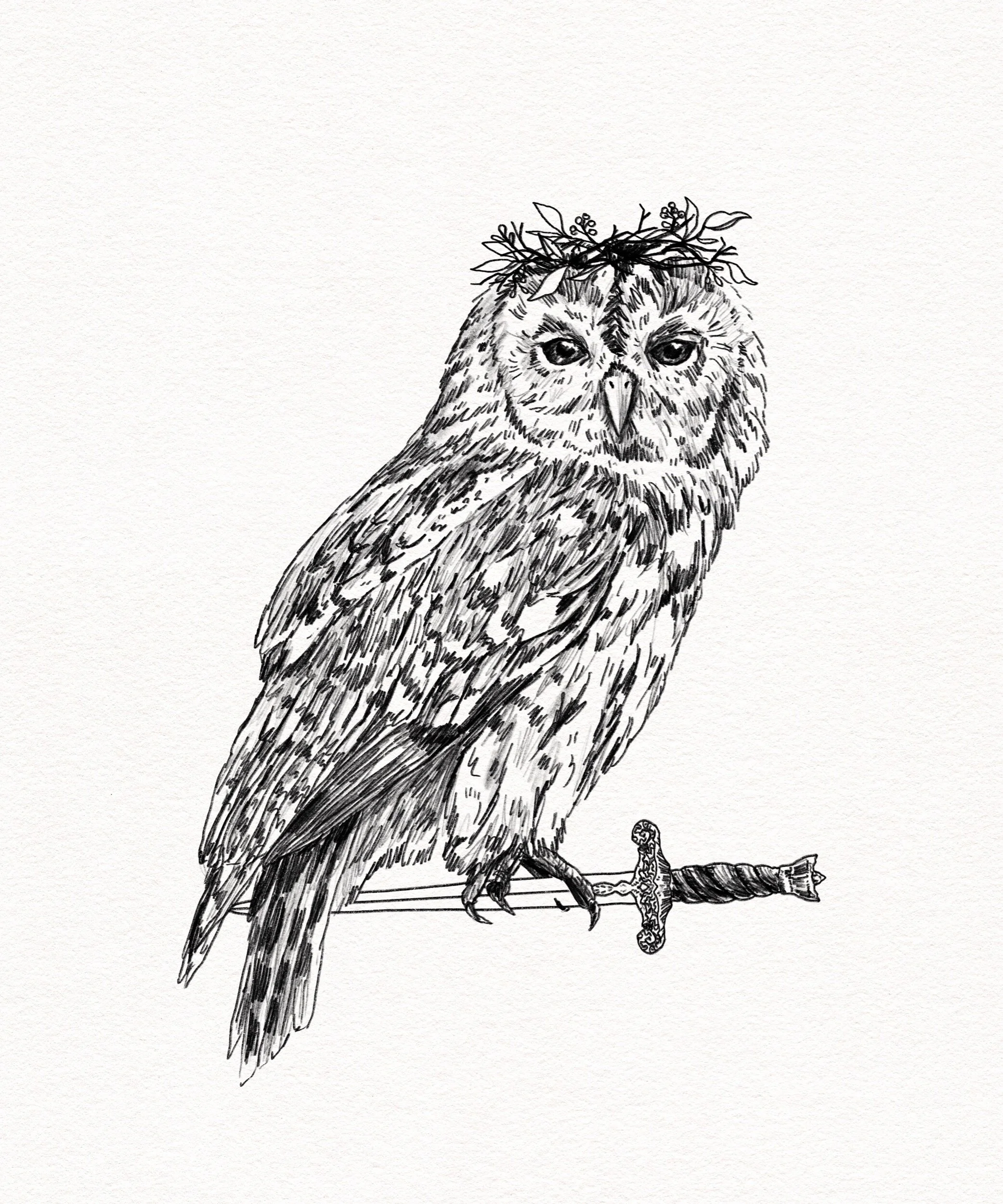 Following on from finding Tarot card archetypes within my illustrations, I decided I wanted to create this one with the intention of it having a King of Swords (or in this case, daggers) vibe. I’m particularly smitten with the crown of twigs and leaves I have drawn for him. The suit of Swords are normally associated with the element of air and intellect so I think it’s a good match for an Owl!