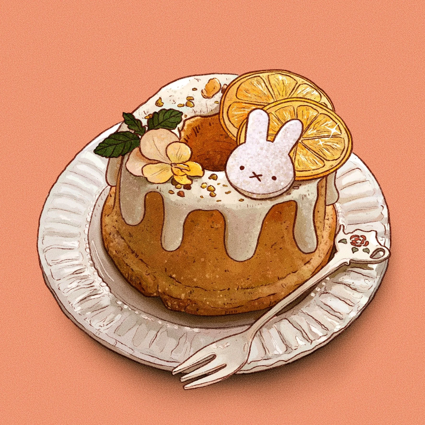 I really enjoyed working on this illustration, it was the first time I tried drawing a lemon-flavoured one which was something I’ve been meaning to try for a long time. The lemons and viola that garnish the top of the cake were really fun to draw and I’m keen to include more like this in my upcoming work.