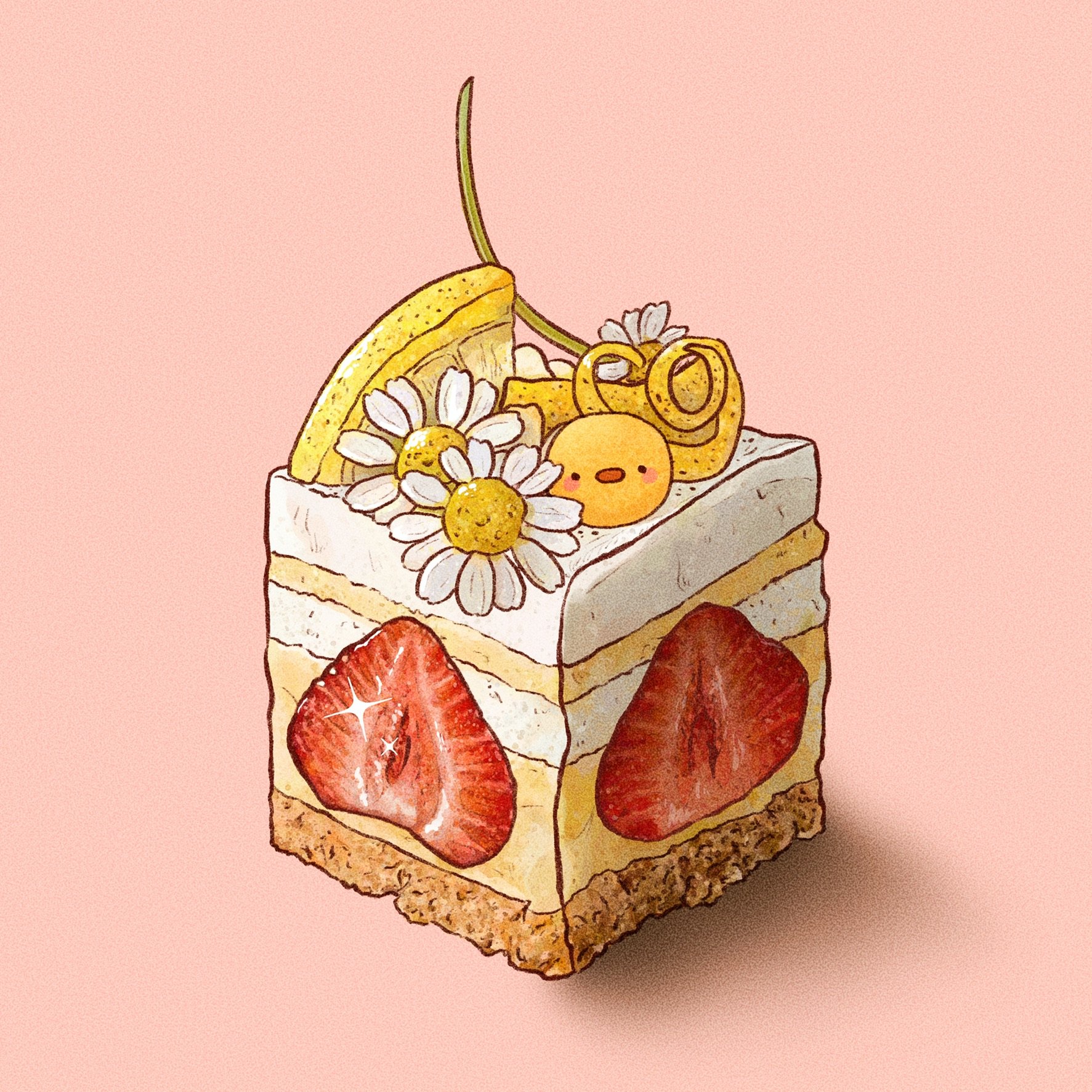 Here’s the second illustration of my spring series! Like I mentioned in yesterday’s post, some aspects of those sketches went on to become this. Most notably, the arrangement of lemon and chamomile was inspired by the panna cotta sketch on the left page, the Rilakkuma cookies of the strawberry dessert lead to me adding a little duck/chick cookie to the top of this cake, and the strawberry tulip dessert on the right page prompted me to add strawberries to the sides of the cake!